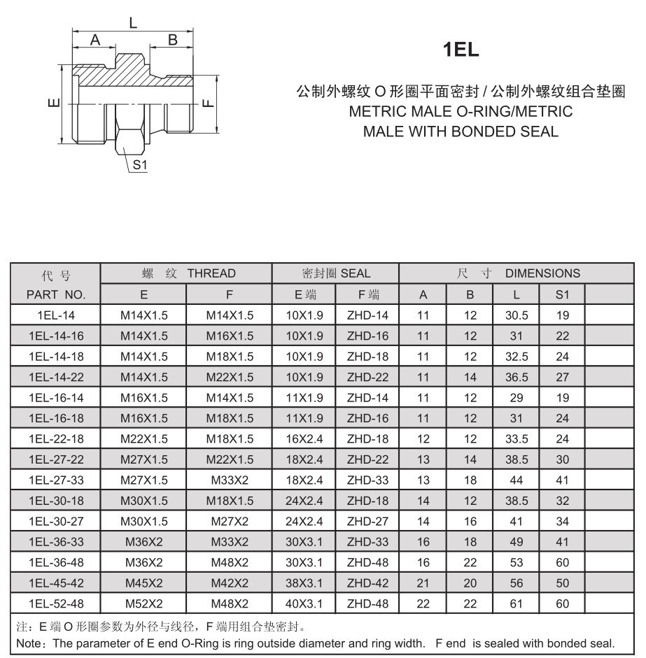1EL系列直通端面過渡接頭公制外螺紋O 形圈平面密封組合墊圈